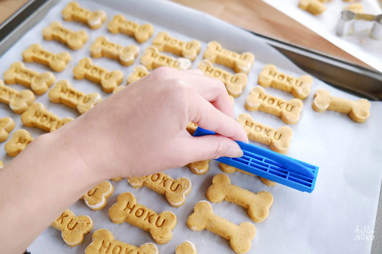 Dusting off the old blog today with a recipe for Peanut Butter & Pumpkin dog treats, from My Baking Addiction. I was really excited to use my new dog bone cookie cutter and letter embossing set to personalize each cookie with Hokuβs name.